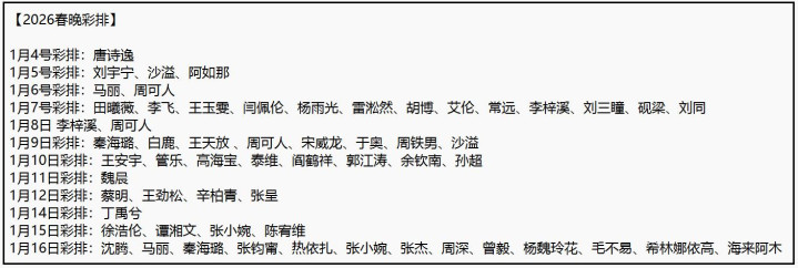 截至1月16日,有50多位艺人先后现身彩排现场,其中就包括沈腾、马丽、唐诗逸、蔡明、沙溢、白鹿、玲花、丁禹兮等人。